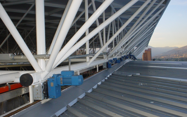 La configuración de la estructura es un marco principal que soporta el techo móvil y las vigas secundarias. Las estructuras principales consisten en dos cuerdas de tubo redondo superior e inferior de 12 pulgadas. Columnas de montaje temporales para ensamblar las "super-estructuras requeridas".